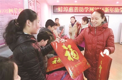日前,安徽省蚌埠市禹会区秀水社区活动室里暖意融融,由致公党蚌埠市委会助学志愿者发起的“2016年新春助学活动”正在这里举行。10名家庭困难的学生每人获赠一个装着学习用品的书包和部分助学金。志愿者和学生们一起进行才艺表演,现场欢歌笑语。据悉,志愿者利用蚌埠慈善助学网这一平台,已连续5年组织开展助学活动。 张建平 摄影报道