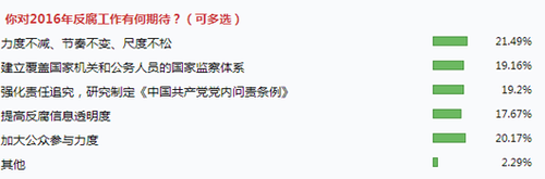 对于2016年的反腐败工作,网友最大的期待是“力度不减、节奏不变、尺度不松”。其他期待按得票高低依次为“加大公众参与力度”、“强化责任追究,研究制定《中国共产党党内问责条例》”、“建立覆盖国家机关和公务人员的国家监察体系”、“提高反腐信息透明度”。