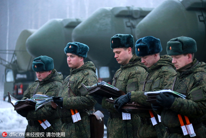 当地时间2015年2月25日,俄罗斯伊万诺沃州,RS-24亚尔斯洲际弹道导弹系统准备进行“胜利日”大阅兵彩排。