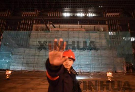2月27日,工人在拆除位于北京复兴内大街18号的国家开发银行总部大楼大门前的牌坊。当日,位于北京市长安街沿线的复兴内大街18号的国家开发银行总部大楼大门前的牌坊被围挡围住,工人们正在连夜进行拆除。 新华社记者 罗晓光摄