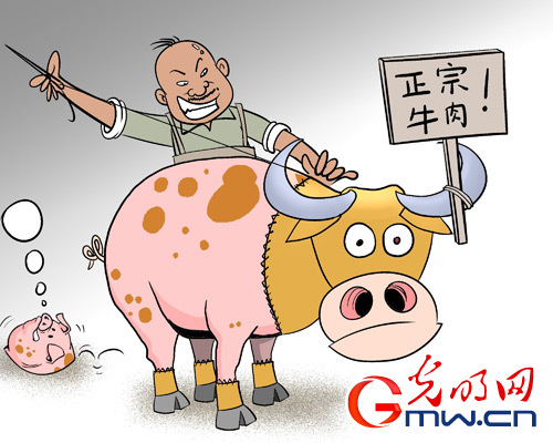 牛肉和猪肉价格悬殊,受暴利驱使,少数肉贩动起了歪心思,通过添加硝、牛肉精、胭脂红等将猪肉制成“牛肉”,甚至做起“手术”,将猪肉拼接在牛腿上对外出售。1月6日,安徽明光市警方破获一起重大生产、销售假牛肉案件,涉案9万余元,犯罪嫌疑人华某某夫妇已被刑拘。(据1月11日《都市快报》)