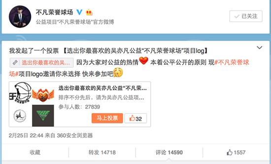 据悉,“不凡荣誉球场”是吴亦凡发起的个人篮球公益项目,旨在为缺少篮球场的学校建立球场并配套相关设施,通过吴亦凡本人的身体力行带动篮球运动在中国校园的普及,激励每个热爱篮球的孩子勇敢的去追逐梦想。项目开设以来开始向网友征集logo,在规定时间内已有上万人参与设计,其中很多设计都有极强的专业度,让网友感叹“吴亦凡粉丝质量简直太高了!”由于参选者太多,本着公平公正公开的原则,“不凡荣誉球场”项目决定发起投票,通过网友的投票来决定该项目最终的logo。投票开启仅半小时,超万人进行投票,该投票仅能进行单人单次投票,这数万人的参与即刻引发网络轰动,不少人为究竟该选哪个logo而纠结不舍。