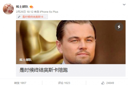 这篇“力挺文”发布后,网友纷纷声援:“我猜子怡一定投了小李的票”“写的真好,大爱小李子,今年小金人非你莫属?!薄白逾缫芽创┮磺校刃±钚瞧谝辉缟戏獾邸薄拔彝δ阒С治依睢啊白詈笠痪涮粤?,无论结果如何,奥斯卡最佳男主角不会是他的终点。所以,看到大满贯之后的子怡,我知道,这是个新的开始!