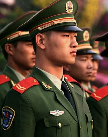 4、 八十年代中期至新世纪二零零七年十月(1984年10月-2007年)。1982年,迎着改革开放的东风,全国范围内重新恢复组建中国人民武装警察部队,1984年10月1日,在建国35周年首都国庆大阅兵盛典上,参加阅兵式的武警方队首次穿着让人耳目一新的83式武警制服,随后,全国武警部队陆续换着新式盾牌帽徽、红领章保留、增加了镶有武警标志的盾牌的肩袢;1991年,全国武警部队取消红领章,军装衣领上改掇武警图案领花(先是红色的,随后又改为蓝色图案)。