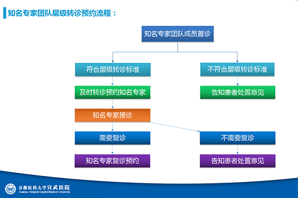2016年2月22日起,首都医科大学宣武医院实施知名专家团队层级预约诊疗模式,首批设置了四个知名专家团队门诊,每个团队门诊由一名知名专家和若干名主治医师以上成员组成。宣武医院挂号室主任刘德海表示,门诊挂号窗口不再开放知名专家号,统一采取知名专家团队层级预约诊疗的方式,即患者首诊挂知名专家团队专科号,团队成员接诊后,对于符合转诊标准的患者,通过医生工作站预约本团队的知名专家。如果患者病情并不复杂,团队成员会直接诊治,不再转诊。知名专家接诊后,对于病情确实复杂需要复诊的患者,可直接预约复诊时间。