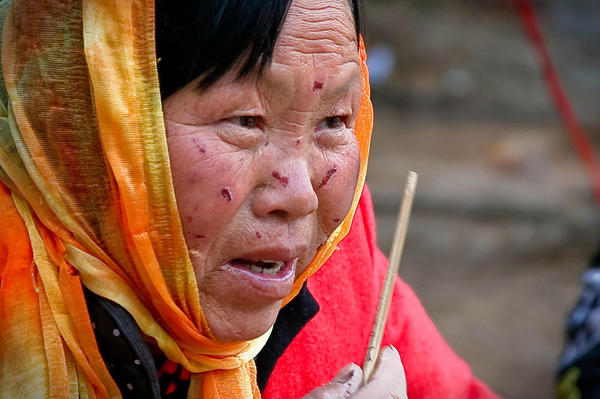 一位妇女用利器把脸部戳烂,自称是“萧国第一女相师”,麻衣神相传人。