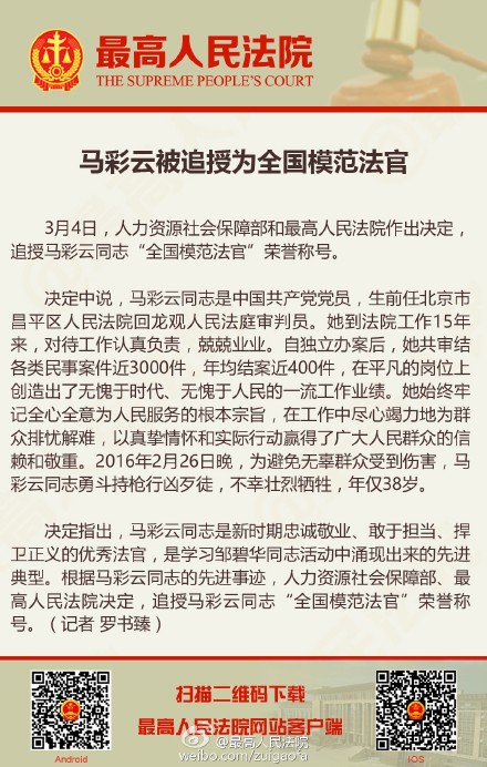 中新网3月4日电 据最高人民法院微博消息,3月4日,人力资源社会保障部和最高人民法院作出决定, 追授马彩云同志“全国模范法官”荣誉称号。决定指出,马彩云同志是新时期忠诚敬业、敢于担当、捍卫正义的优秀法官,是学习邹碧华同志活动中涌现出来的先进典型。