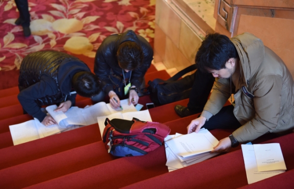 3月5日,第十二届全国人民代表大会第四次会议在北京人民大会堂开幕。这是记者在人民大会堂内领到相关文件后抓紧阅读。 新华社记者薛玉斌摄