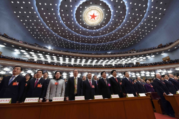 3月5日,第十二届全国人民代表大会第四次会议在北京人民大会堂开幕。这是全体起立唱国歌。 新华社记者 饶爱民 摄