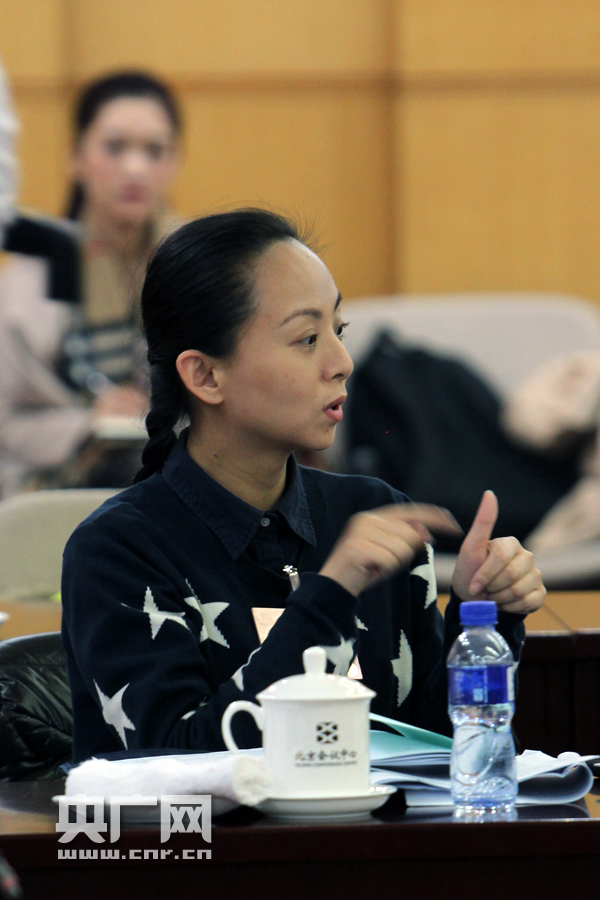全国政协十二届四次会议文艺界别小组讨论会中,邰丽华委员通过手语翻译表达自己的观点(记者杨晓凡_摄)
