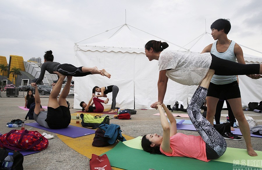 2016年3月5日,中国香港,美女在街头练瑜伽,大秀好身材。