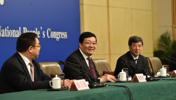 3月7日,十二届全国人大四次会议新闻中心举行记者会,邀请财政部部长楼继伟、部长助理许宏才就“财政工作和财税改革”的相关问题回答中外记者的提问。新华社记者 赵颖全 摄