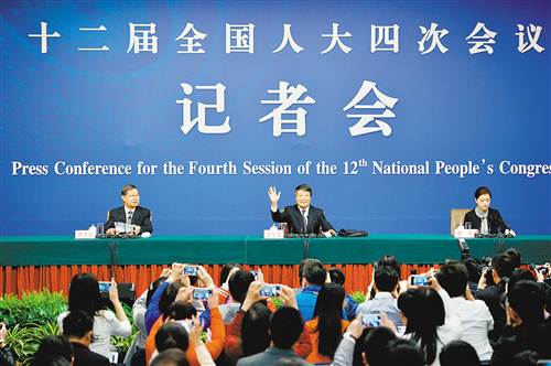 3月6日,十二届全国人大四次会议新闻中心举行记者会,邀请国家发展和改革委员会主任徐绍史就“经济社会发展情况和‘十三五’规划《纲要》”的相关问题回答中外记者的提问。新华社记者李鑫 摄
