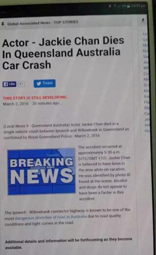 “成家班”冯克安因食道癌过世,有国外媒体报道称,成龙遭遇惨烈车祸身亡
