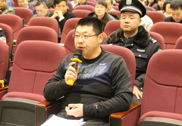 3月7日,杨成林的儿子杨海(前)在回答审判长的问题。