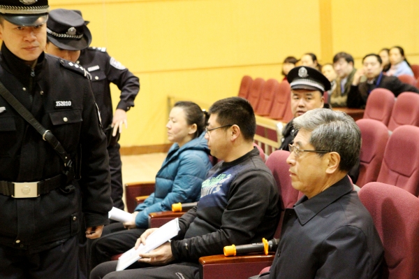 3月7日,杨成林(右一)、杨海(右二)、张婷(右三)在法庭受审。