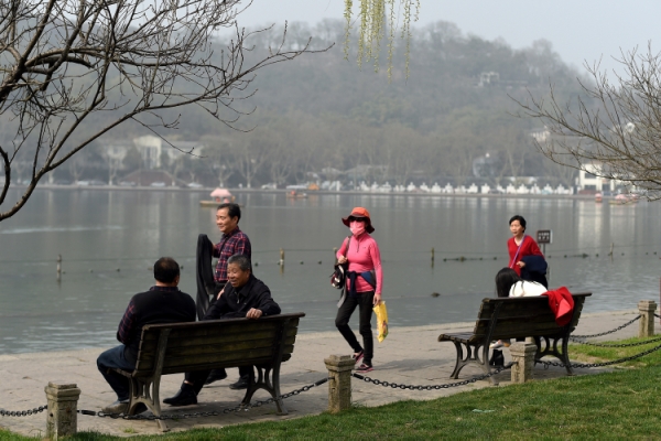 3月7日,游客戴着口罩在杭州西湖景区的白堤上游览。
