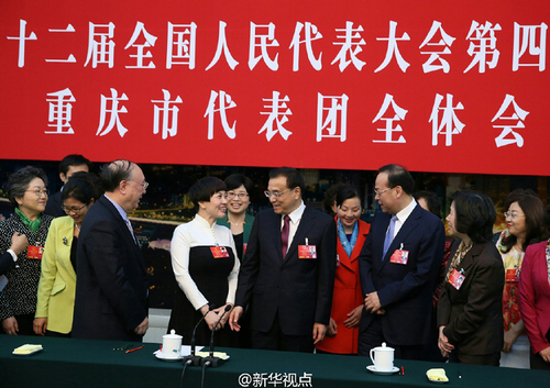 8日上午,李克强在参加十二届全国人大四次会议重庆代表团全体会议时,现场女代表提议总理会后和女同胞们合影。李克强当即答应,并向在场的所有女代表,以及参加“两会”的全体女代表委员、工作人员致以三八妇女节问候。