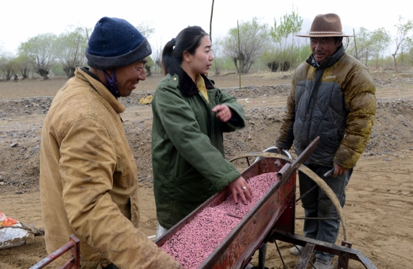 德吉央宗(中)在田间指导农民药剂拌种(2015年4月24日摄)。