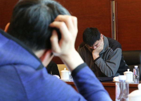 3月9日,全国政协委员姚明和刘翔(左)在小组讨论中阅读“关于2015年国民经济和社会发展计划执行情况与2016年国民经济和社会发展计划草案的报告”。新华社记者殷刚摄