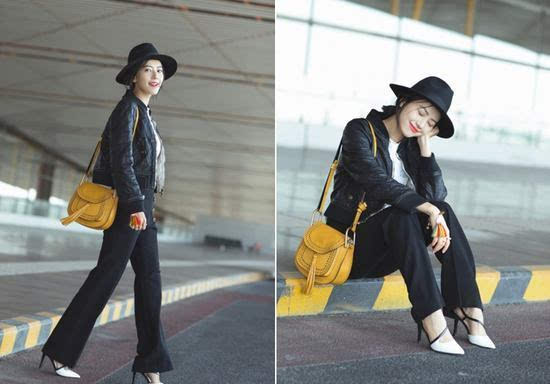 启程奔赴巴黎时装周当天,高圆圆一改往日甜美形象,黑色夹克配上大红唇,“攻”气值爆表!肩上那只大号Hudson姜黄色流苏包更是十足吸睛,腕间还佩戴了品牌2016春夏系列彩虹流苏手镯,细节度满分!