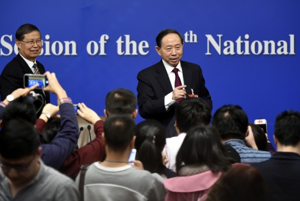 3月10日,十二届全国人大四次会议新闻中心举行记者会,邀请教育部部长袁贵仁就“教育改革和发展”的相关问题回答中外记者的提问。这是记者会后,袁贵仁继续回答记者提问。新华社记者 陈益宸 摄