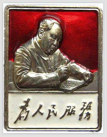 这枚像章在铸造制版时省掉了照片上原有左下角的茶杯和右侧的台灯。毛泽东神态自然,正在专心致志地抄写唐诗,像章下方铸有毛泽东手书“为人民服务”字样。像章背面有别针,并刻有“毛主席万岁”、“东方红”字样。这是一枚在“文革”期间铸造的毛泽东“坐式”像章,笔者一直保存至今,极其珍爱。在“文革”时期,这种以毛泽东工作照为蓝本制作的主席像章有诸多版本,除长方形状外,亦有圆形、腰鼓形等。(朱积良)