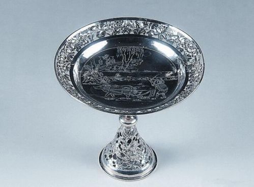 图中是一只清代的高足银盏,为纯银打造,高13.4厘米、重173克。它的底座呈圆锥形,采用镂空雕的形式,雕刻有花纹。雕刻图案是一丛娇艳盛开的牡丹,有的雍容华贵,有的含苞待放,有的似开未开,枝、叶、茎、花,都雕刻得形象而生动,看来工匠的雕工十分了得。底座而上,是中空的呈倒圆锥形的一个圆筒,上下两个圆锥之间,用扁平圆盒状凸起相接。倒圆锥托着的,是一只浅盘,直径14.5厘米,高5.7厘米。在盘子的边缘,是有3.4厘米宽的镂空雕,雕刻的是稠密相间、枝叶相连、花叶相绕的一排牡丹,每枝牡丹均开出一朵花,和前一枝牡丹的花枝相接,排成一道醉人的场景。