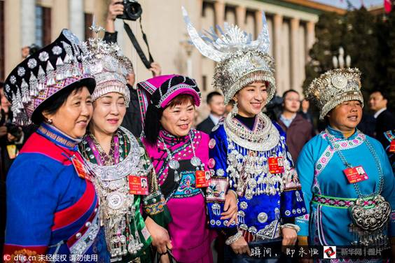 2016年3月5日,北京,来自贵州的少数民族代表身着民族服饰,在人民大会堂前合影留念。