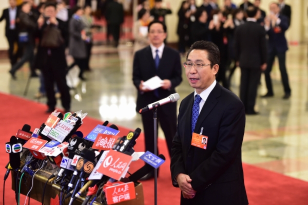 3月13日,十二届全国人大四次会议在北京人民大会堂举行第三次全体会议。这是会前,国家知识产权局局长申长雨接受媒体记者采访。新华社记者 刘军喜 摄