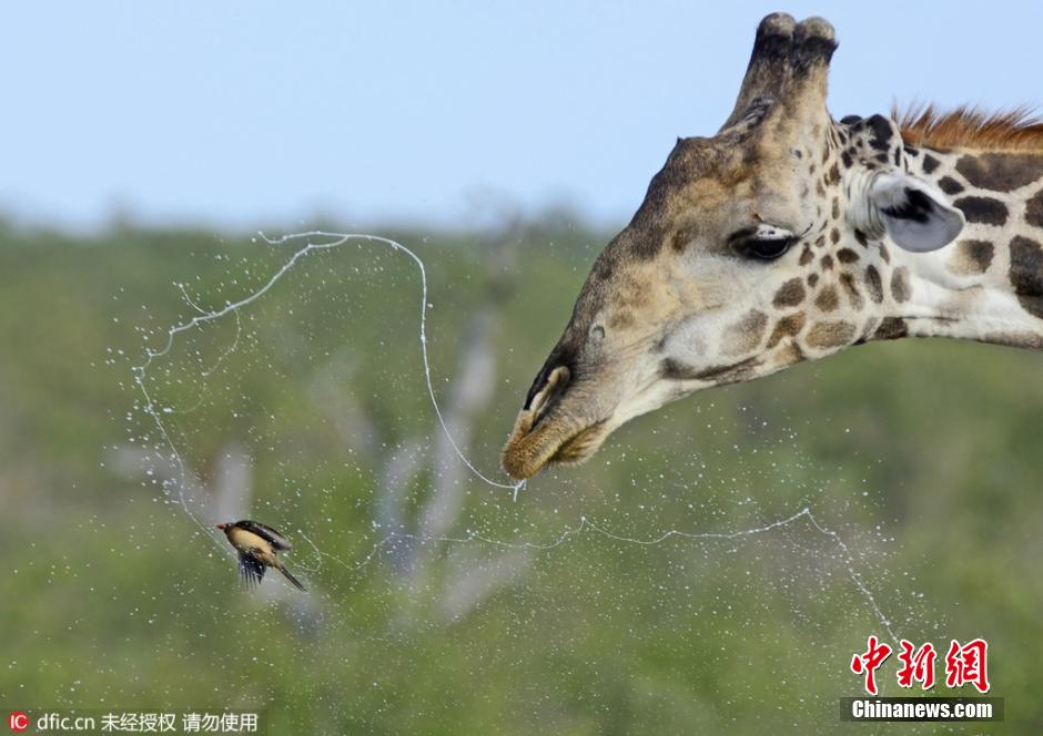 2016年3月13日消息,这只倒霉的牛椋鸟很显然在一个错误的时间出现在了错误的位置,结果被长颈鹿的一个大喷嚏弄了一身口水。当时,这头长颈鹿正在水坑边喝水,而牛椋鸟正在清理它的耳朵,结果它突然打了一个大喷嚏,把小鸟的用餐时间变成了淋浴时间。图片来源:东方IC