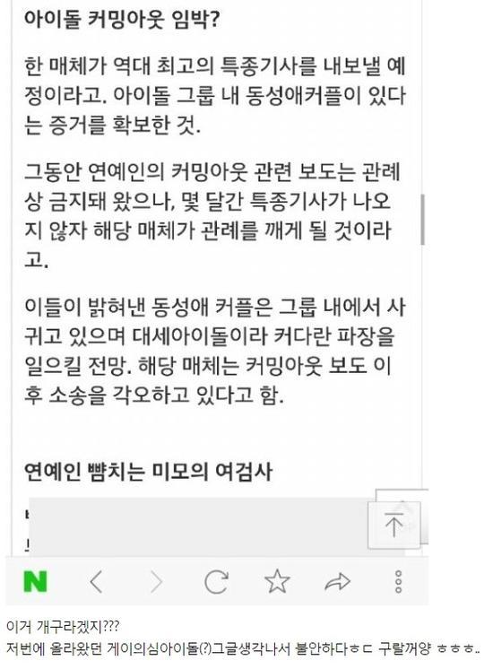 然而,文章中的同性情侣被形容为,同团体内的两名同性成员,且该团是目前炙手可热的大势偶像,消息一出后马上引起大批网友讨论,更有乡民马上联想到2015年时,曾有人爆出某男团偶像是同性恋的消息,引起诸多揣测,只不过由媒体爆出偶像同性恋爱的这个举动,也遭到不少网民讨伐,认为擅自对人强制出柜是件霸凌的行为。