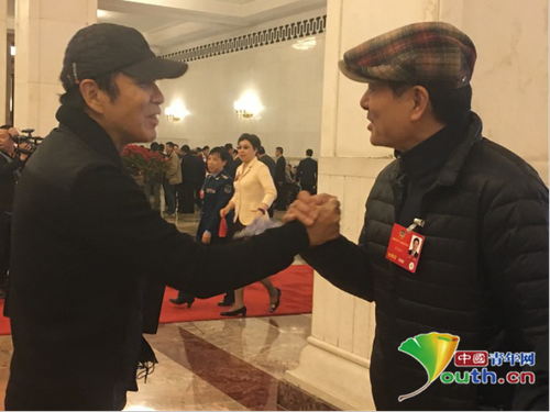 陈道明与濮存昕在人民大会堂一楼大厅不期而遇,俩人“掰腕”打招呼。 记者 任润波 摄
