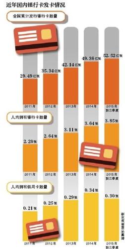 央行最新数据显示,截至2015年第三季度末,全国银行卡在用发卡数量52.52亿张,同比增长10.66%,环比增长4.37%。这比截至2013年底的发卡数量增加了10.38亿张。平均每人持有3.85张银行卡。其中,人均持有信用卡0.30张。