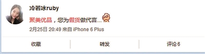 2月25日,@冷若冰ruby在微博上写道:“聚美优品,您为假货做代言……”