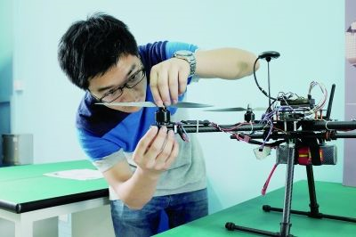 在东华大学众创空间,机械工程专业学生在调试无人机。