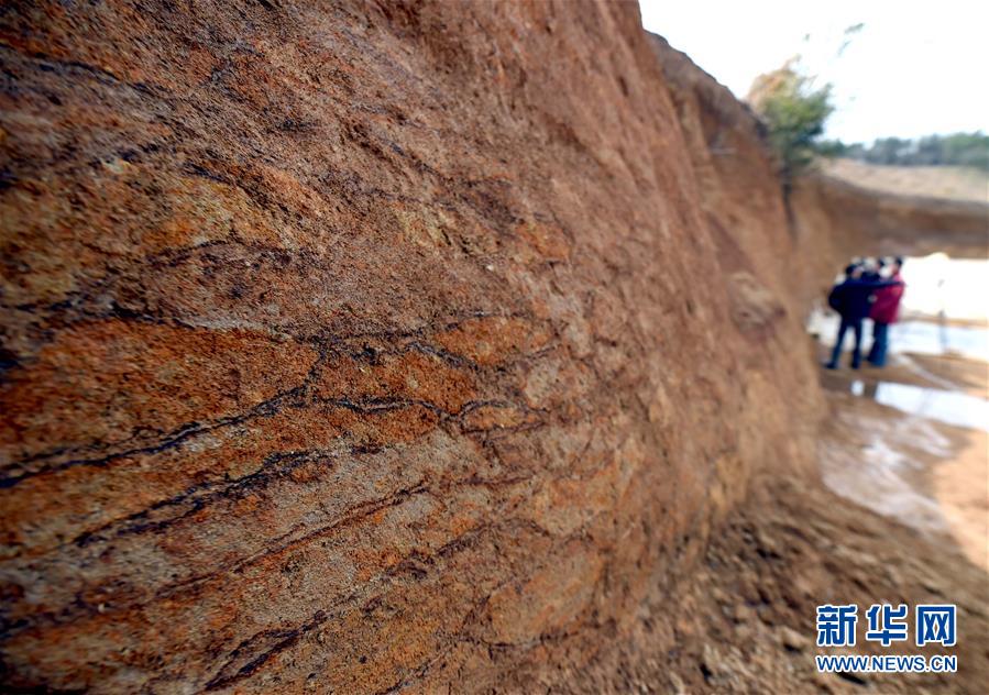 3月15日拍摄的古代水利工程的堤坝部分,关键部位以“草裹泥”工艺堆垒加固(黑色细条为草碳化后的痕迹)。考古学者近日宣布,浙江省杭州市西北郊发现了中国已知最古老的大型水利工程,距今已有约5000年历史。这处水利工程位于余杭区瓶窑镇境内。80年前,在当地的良渚,考古学者发现新石器文化遗存良渚文化。新华社记者 王定昶摄