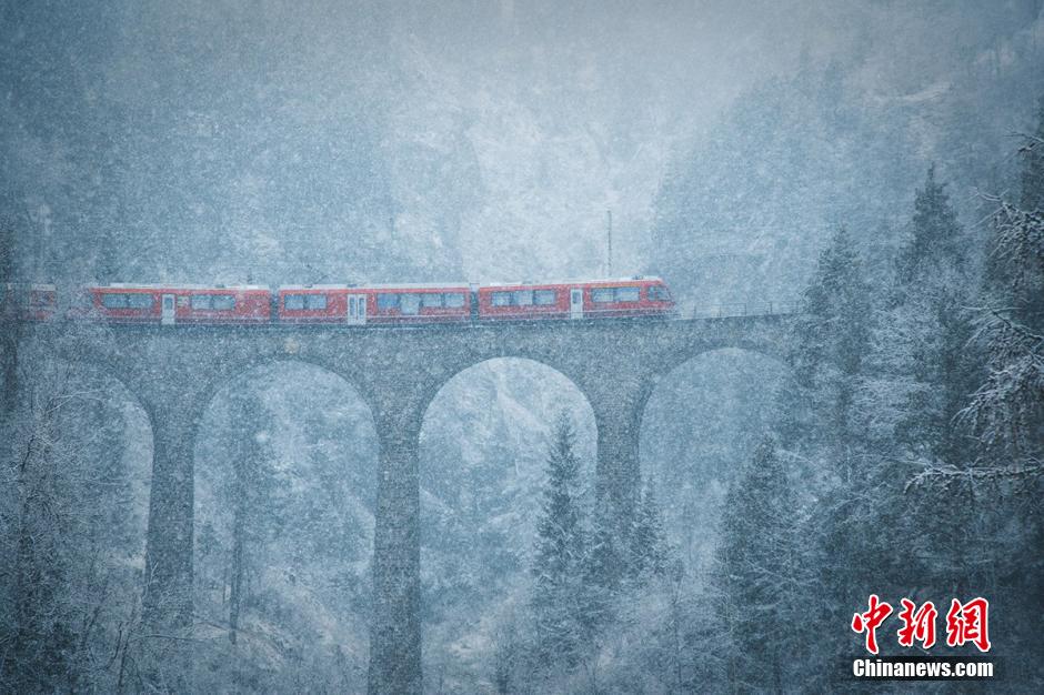 3月15日消息,瑞士,一列红色的火车冒雪从朗德瓦萨高架桥上驶过,仿佛童话里的场景。这座高架桥高65米,长136米,建造于1901-1902年间,如今仍在使用,是世界遗产地雷蒂亚铁路及沿线风景中的标志性建筑。