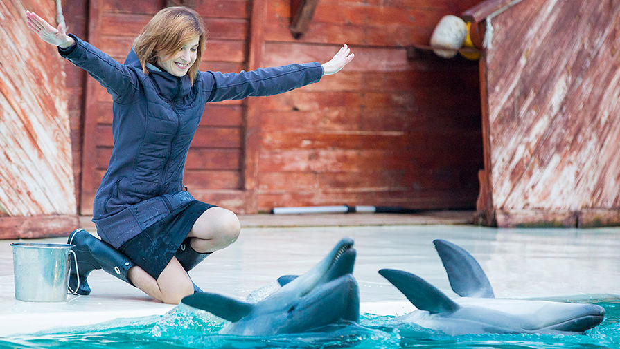 娜塔莉亚·波克隆斯卡娅在水族馆中与海豚玩耍,少女心爆棚。