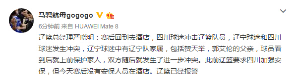 随后,辽篮跟队记者表示,球队总经理严晓明称:“赛后回到去酒店,四川球迷冲击辽篮队员,辽宁球迷和四川球迷发生冲突,辽宁球迷中有辽宁队家属,包括贺天举,郭艾伦的父亲,球员看到后就上前?;ぜ胰?,双方随后就发生了进一步冲突。此前辽篮要求四川加强安保,但今天赛后没有安保人员在酒店,辽篮已经报警。”