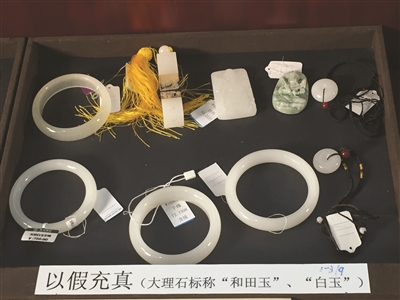 低劣的石英岩、大理石假冒天然翡翠、和田玉;劣质翡翠经过漂白、充填或染色后冒充高档天然翡翠……3.15前夕,省质监局对省内生产、销售的玉石产品开展了监督抽查。共抽查99家企业生产、销售标识为“翡翠”、“和田玉”等产品118批次。其中,生产企业10批次、实体店(商超、旅游景点、宾馆)66批次、电商(网络、电视购物)42批次。依据国家标准对118批次玉石产品进行了检验,94批次产品合格,合格率79.7%。主要问题是,9批次产品存在以假充真现象,7批次产品存在以次充好现象,8批次产品标识不合格。