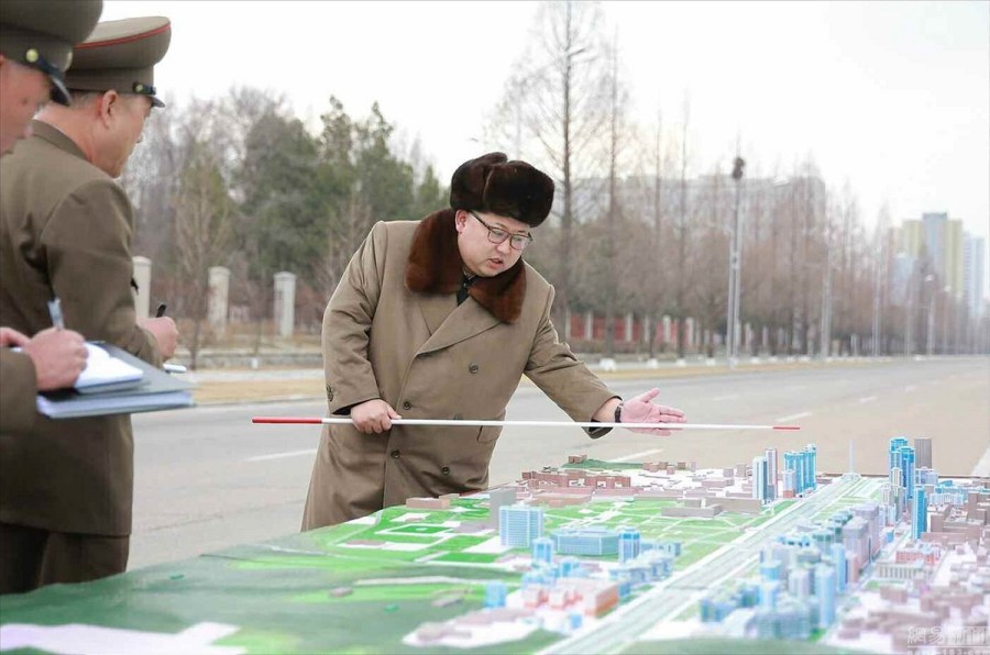 图为朝鲜领导人金正恩站在建筑物模型前,指导和视察平壤建设情况。图/东方IC