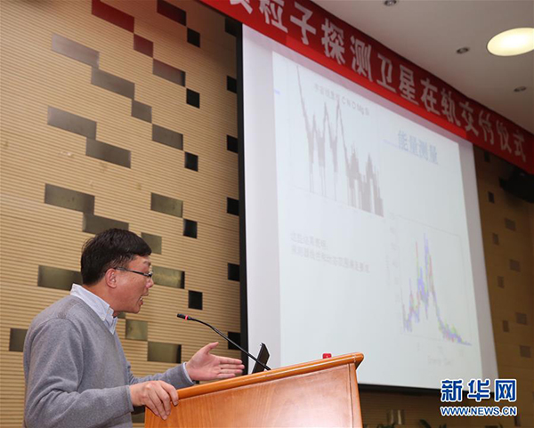 3月17日,在中科院国家空间科学中心,暗物质粒子探测卫星首席科学家常进在介绍卫星下传科学数据初步的科学研究情况。当日,我国空间科学系列首发星——暗物质粒子探测卫星“悟空”圆满完成3个月的在轨测试任务,交付用户单位中科院紫金山天文台。新华社记者 金立旺 摄