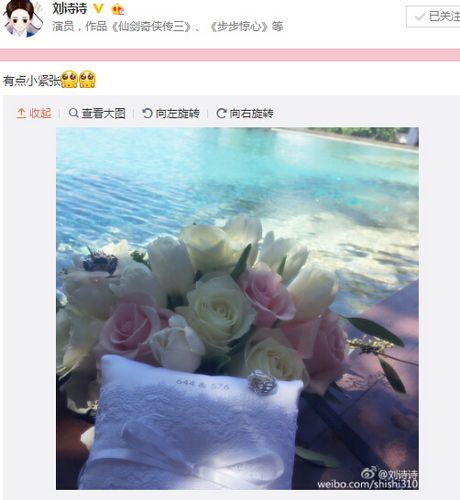 中新网3月19日电 吴奇隆、刘诗诗被曝将于3月20日在巴厘岛大婚,19日下午,刘诗诗在微博发文称“有点小紧张”,并晒出鲜花与钻戒。