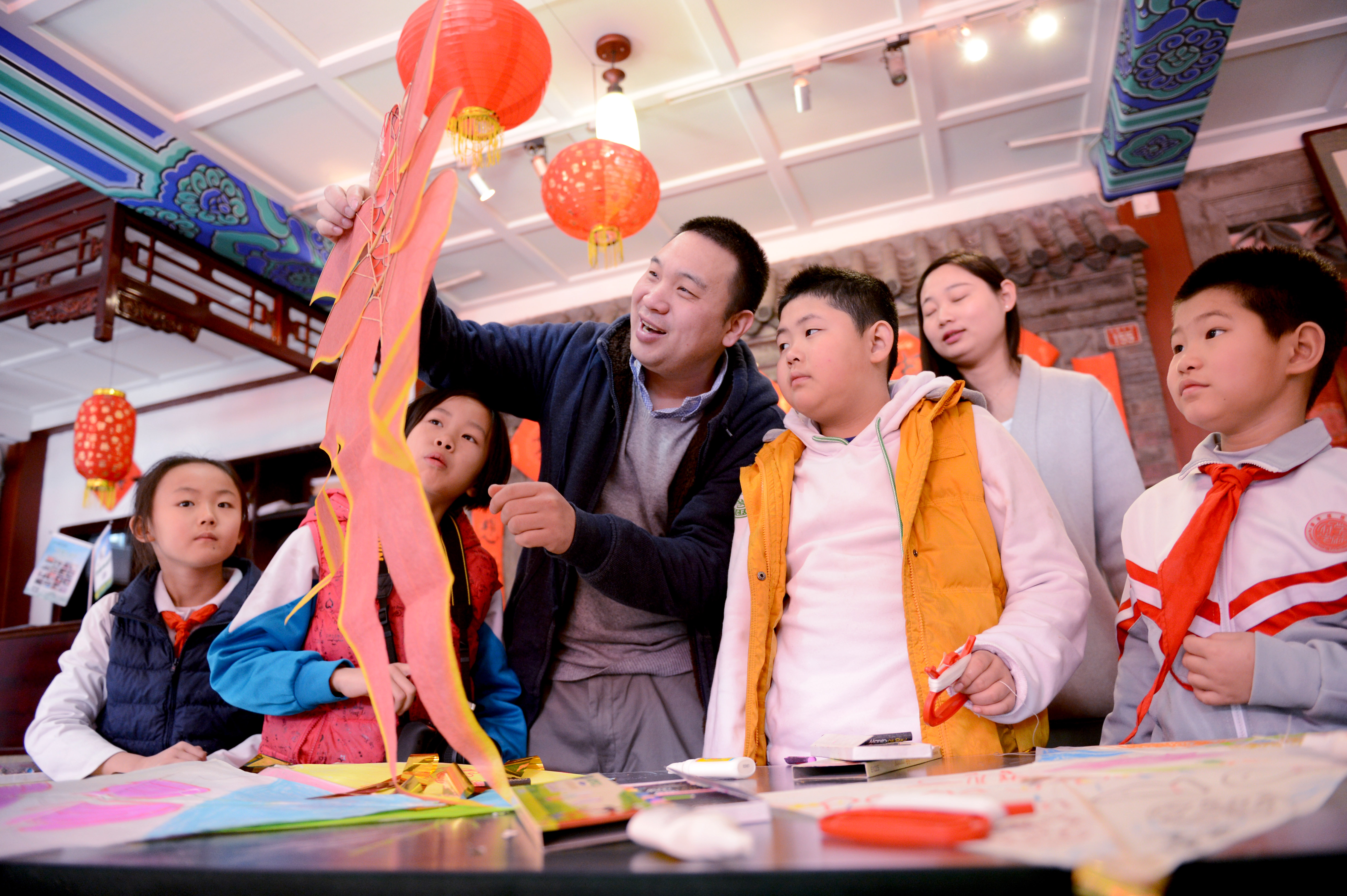 京派宫廷风筝“三石斋风筝”第三代传人刘宾老师向孩子们讲述国家级非物质文化遗产“曹氏风筝”的传承和制作技艺方式方法。