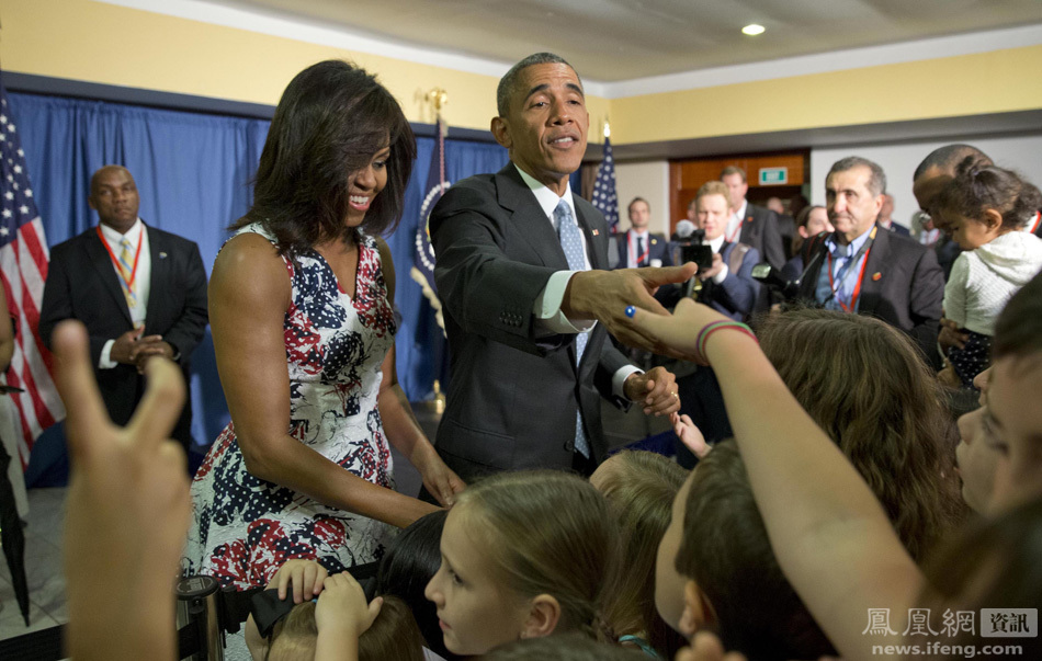 图为奥巴马下机后,在酒店接见大使馆成员的孩子。2015年7月1日,美古宣布就恢复外交关系达成协议。7月20日,美古在双方首都重开大使馆。