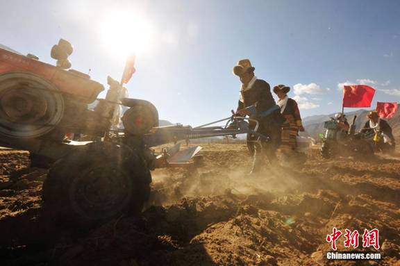 3月16日,拉萨市堆龙德庆县古荣乡加入村村民用手扶拖拉机举行春耕仪式。当日是藏历元月26,根据藏族天文历算,当日是一个适合春耕春播的良辰吉日,西藏多地农牧民按照延续数百年的传统,纷纷以不同形式举行春耕仪式。 中新社发 唐朝杨 摄
