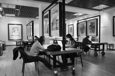 若是在连环画传奇馆上自习,一进门就可以看到满满一面墙各个年代出版的连环画。其中《红牡丹》《屠夫状元》《三滴血》等老版连环画还可以随意翻阅。坐在宽敞的书桌跟前,第一个座位后面的墙面上便是贺友直创作的连环画《贺家班子》的手稿。还有都本基艺术馆棚顶垂挂的艺术葫芦,都本基书画馆内那些直接以这位艺术家书法石碑当桌面的桌子,也都很受同学们欢迎?!巴ü⑿旁ぴ甲皇?,可以看到每个座位的实景图,选座位其实也是在选自己喜欢的展品?!币晃徽诙裂幸坏呐?,来口述史中心上自习无意中帮助自己了解到更多艺术史、电影史?!熬退刀急净?,如果不是来这里上自习,我并不知道他是位集诗书画印于一身的艺术家,也不知道他是崔永元的书法老师?!?/p>