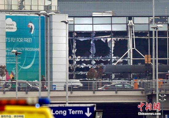爆炸现场画面,机场航站楼的玻璃在强大的冲击波下被震碎。