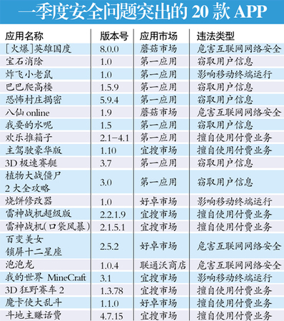 昨日,广东省公安厅网警总队开通“违法APP曝光台”,曝光了第一季度安全问题突出的20款APP,这些APP要么窃取用户信息,要么擅自使用付费业务,有的还危害互联网网络安全,主要为一些游戏类的APP应用,有的下载量高达数百万。省公安厅提醒网民加强防范、及时卸载。